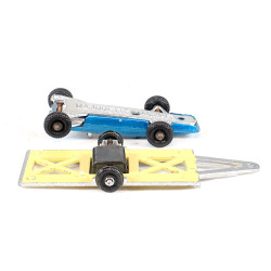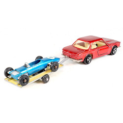 Behind it hangs a Formula 3 racing car, a category that served as the entry-level class for young drivers in the 1960s and 1970s for Formula 1. For children, this combination created an exciting mix: a luxurious sports coupé bringing a racing car to the track.