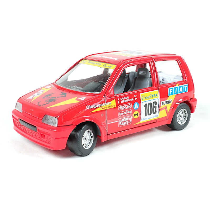 Exceptionally neat Bburago 01094 Fiat Cinquecento Rally in 1:24 scale. This model belongs to the later generation of Bburago models, in which the manufacturer focused on compact European cars in sporty rally trim. The Cinquecento Rally is now a prized collector's item due to its recognizable 1990s look and the popularity of the genuine Fiat Cinquecento.