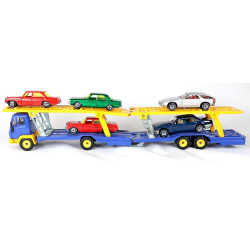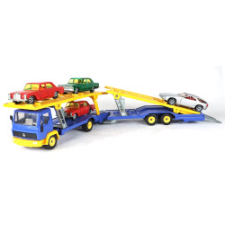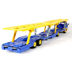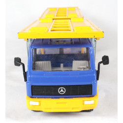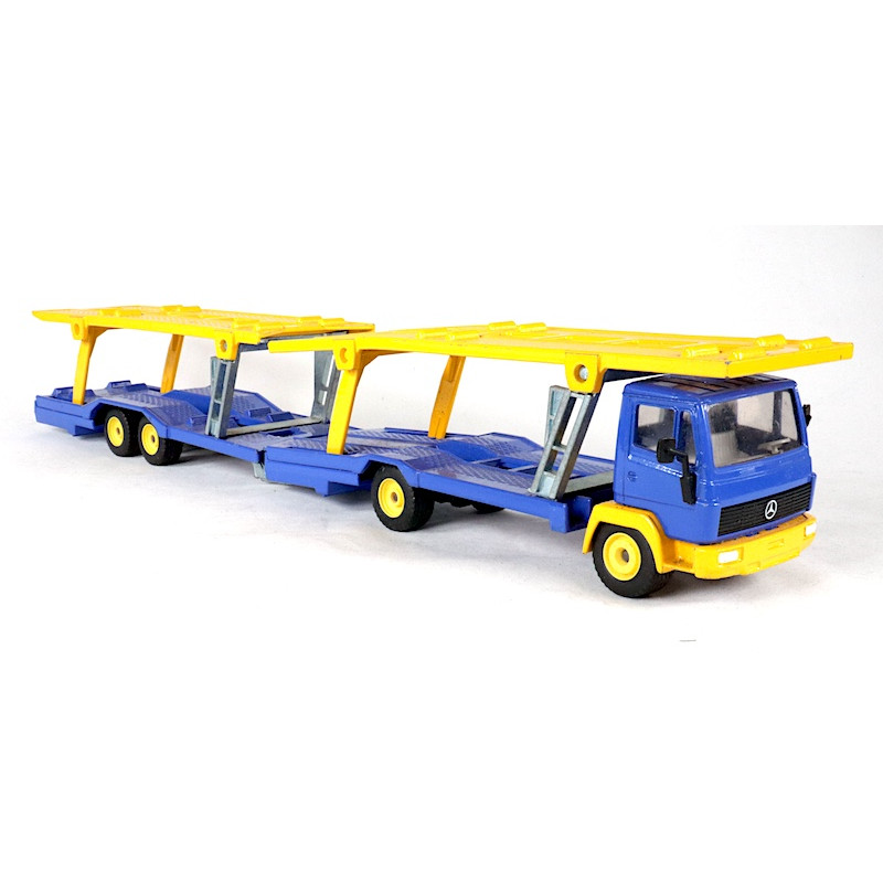 The Mercedes-Benz Car Transporter itself is based on a recognizable cab-over-truck with a long trailer for transporting multiple cars. The trailer is equipped with ramps and loading ramps that simulate the loading and unloading of vehicles. Its compact yet detailed scale makes the model ideal for both collection displays and playful use. The design captures the essence of genuine Mercedes-Benz trucks from the 1980s and 1990s, with attention paid to the cab, chassis, and trailer construction.