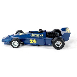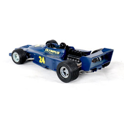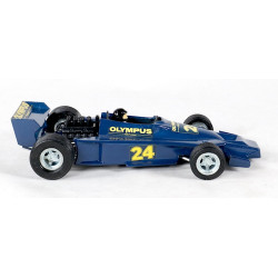 In very good condition, the model displays its sharp contours and carefully applied color accents, which together capture the dynamism of speed and competition. The metal retains its original sheen, the decals are tight, and the wheels look as if they were rolling out of a pit lane again. The small cockpit, half-hidden yet suggestive enough, gives the impression of a racing driver ready to rev the engine at any moment. The model possesses that rare balance between playfulness and technical seriousness, as if it were a small monument to an era when innovation and bravado often went hand in hand.