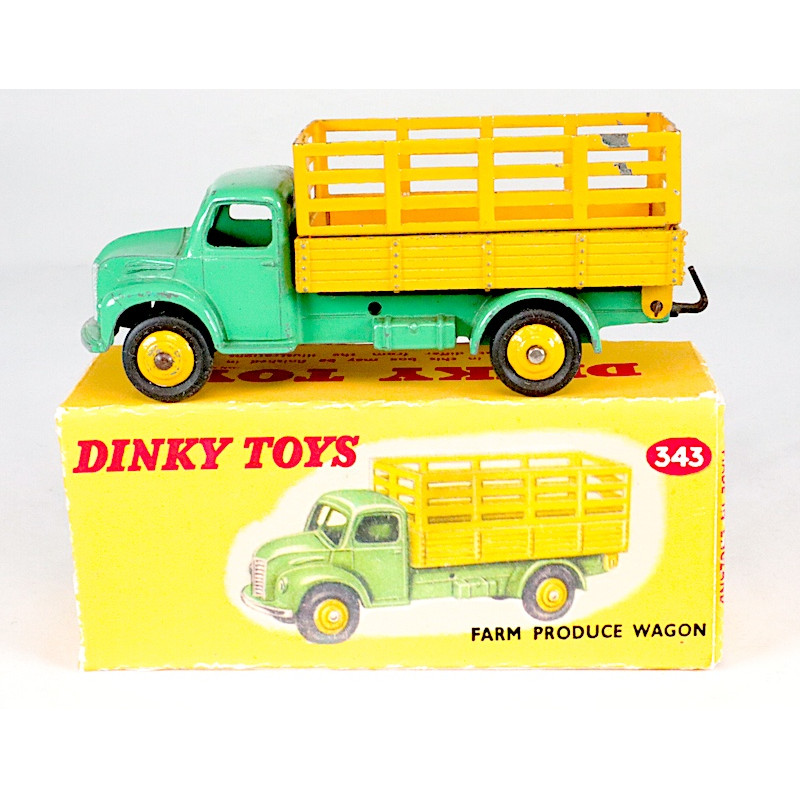 De Dinky Toys 343 Dodge Farm Produce Wagon, geproduceerd tussen 1954 en 1964, is een charmant schaalmodel dat de landelijke en agrarische sfeer van de vroege jaren '50 en '60 vastlegt. Dit model vertegenwoordigt een Dodge Farm Produce Wagon, een type vrachtwagen dat veel werd gebruikt voor het transporteren van landbouwproducten zoals groenten en fruit van boerderijen naar markten en winkels. De Dodge, een iconisch merk uit die periode, was bekend om zijn robuuste voertuigen die geschikt waren voor diverse transporttaken.