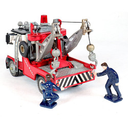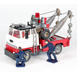 Het model is uitstekend bewaard gebleven. De lak is fris, de takels en haken zijn aanwezig en functioneren naar behoren. De wielen draaien soepel en de opdruk is mooi intact. De originele doos is inbegrepen en nog herkenbaar, maar verkeert in zeer matige staat, met duidelijke gebruikssporen, beschadigingen of verkleuring. Een zeldzaam pluspunt! Naast de originele handleiding zijn de twee bijbehorende figuren ook aanwezig en in goede staat. In de handleiding wordt uitgelegd hoe de dubbele takelinstallatie werkt en hoe het model veilig gebruikt kan worden.
