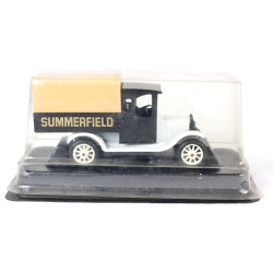 De “Sumerfield”-opdruk geeft dit model een huiselijke, bijna ambachtelijke uitstraling. EFSI gebruikte regelmatig fictieve handelsnamen om hun historische serie extra karakter te geven, alsof elke T-Ford een eigen bedrijfje vertegenwoordigde dat ooit met houten kratten en gedrukte reclameborden door smalle straatjes reed. De Sumerfield uitvoering ademt precies die sfeer van vroeg-20e-eeuwse kleinhandel, een miniatuur dat zijn eigen verhaal fluisterend met zich meedraagt.
